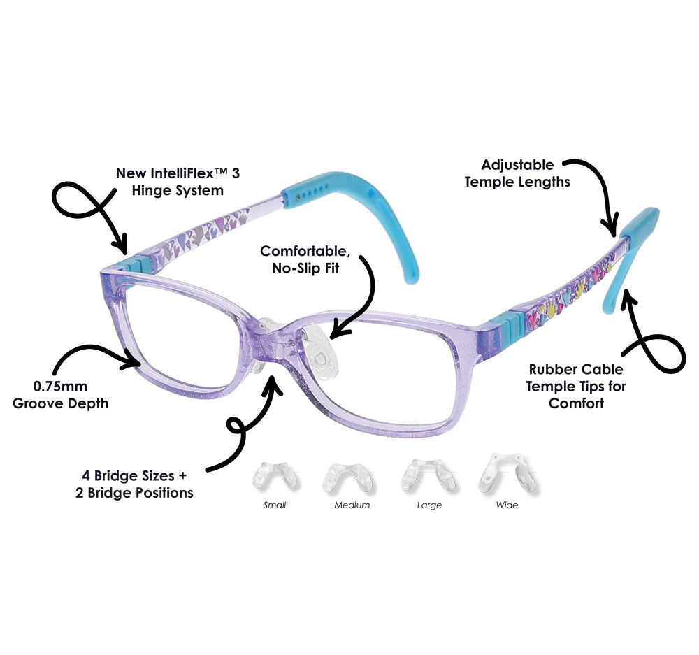 Every child should have frames that fit comfortably without slipping. Variable Fit can be adjusted by ECPs to guarantee the ideal fit for every little one, including those who are hard to fit! The frames have length-adjustable temples and four interchangeable bridges, as well as flexible and durable IntelliFlex™ 3 hinges. Plus, with plenty of colors and patterned temples, these frames are as fun as they are comfortable!